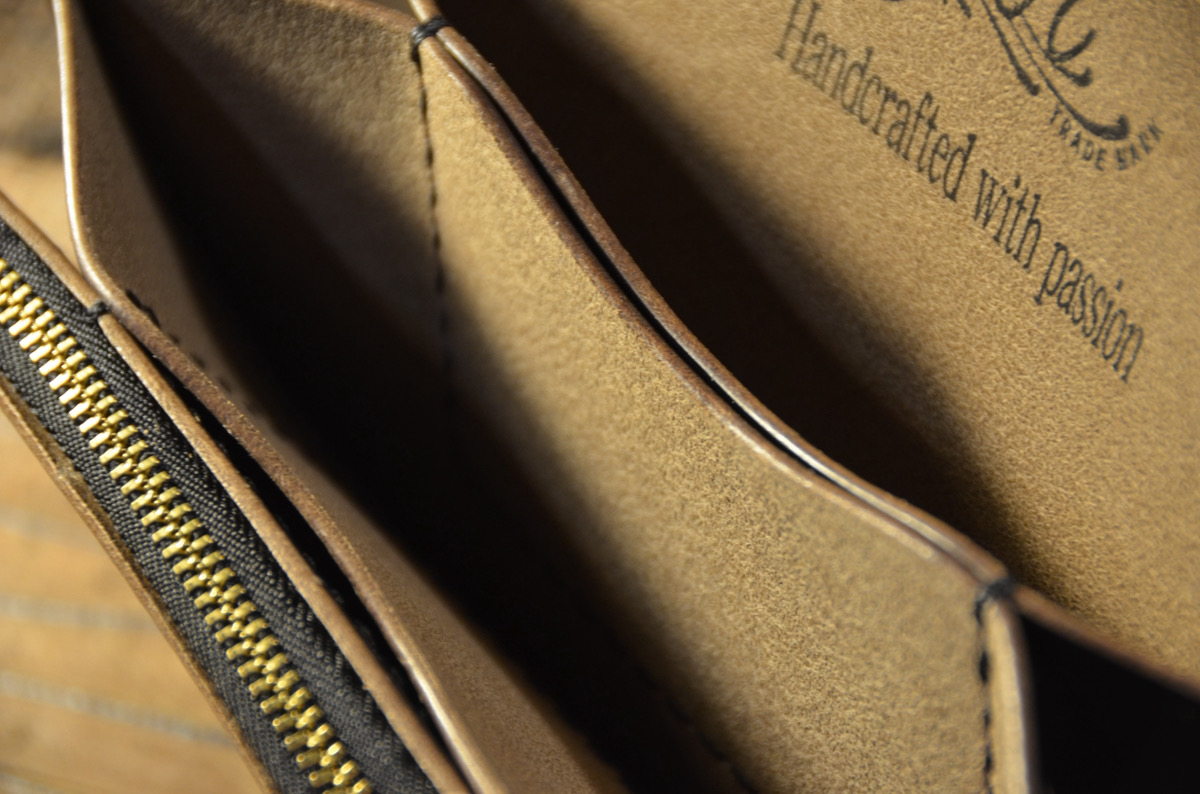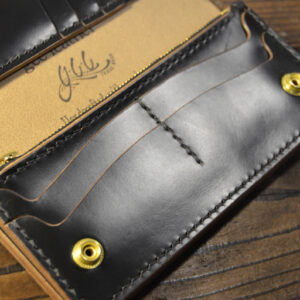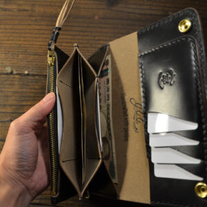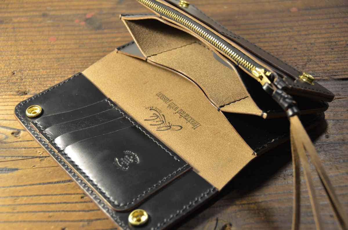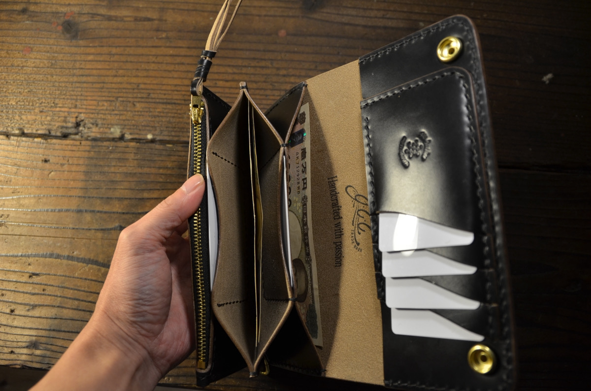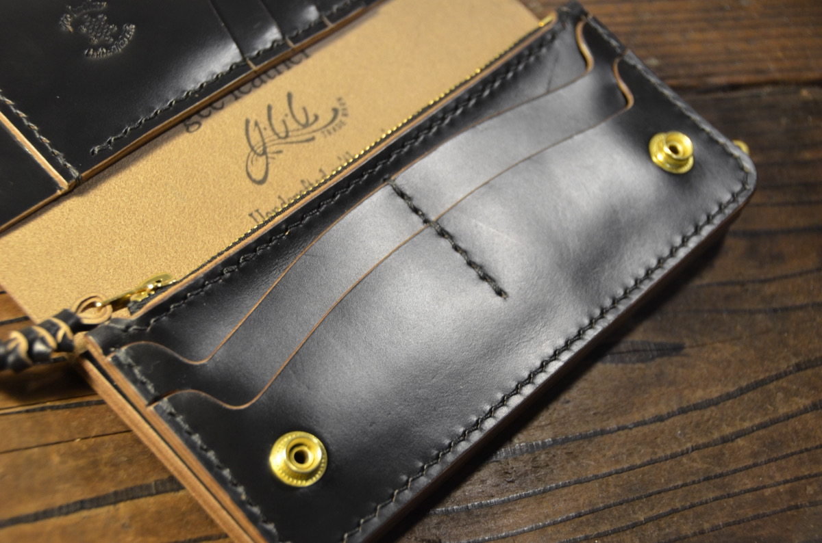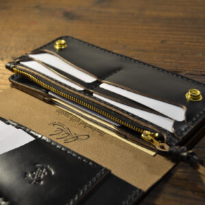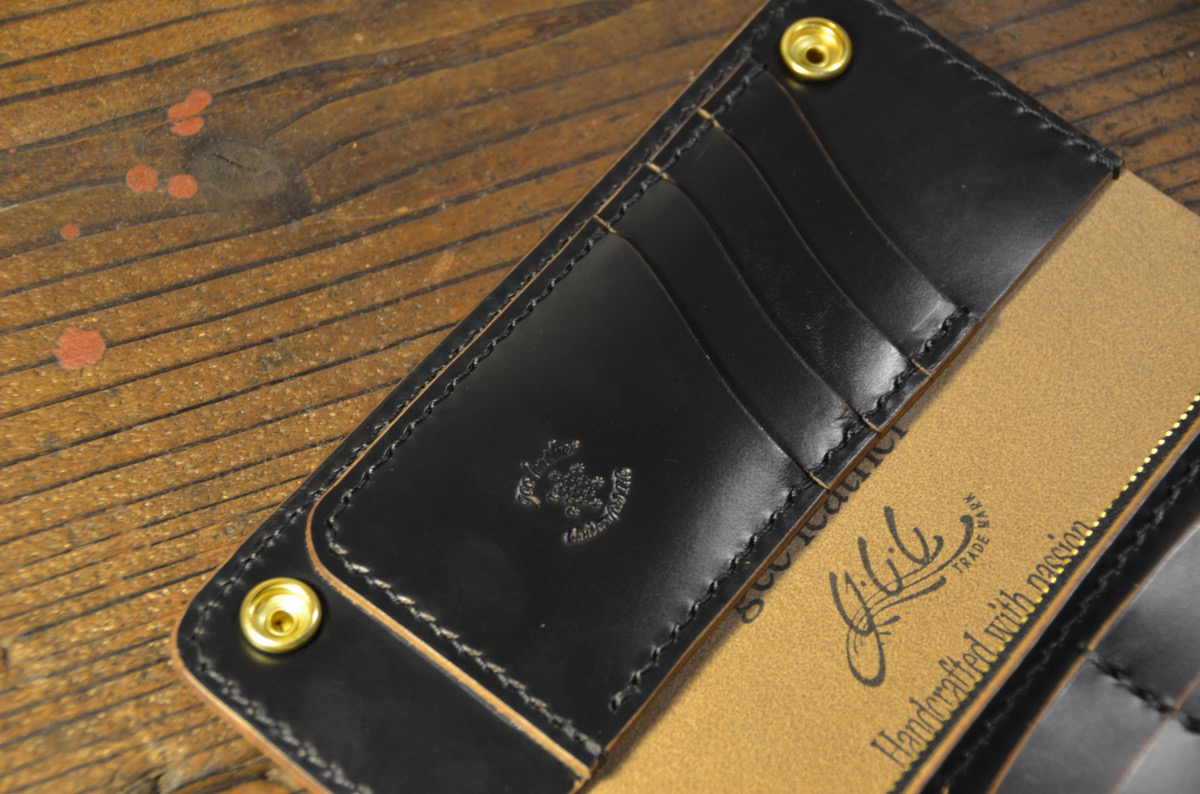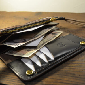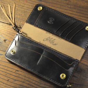 中身の確認もし易く、使いやすい財布に仕上がってます。ウォレットチェーンを付ける用の金具も付いてますので、お好みのチェーンで自分らしさを楽しんで頂けたらと思います。